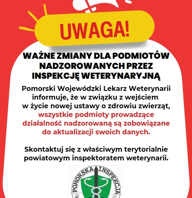 27 marca, 2026Ważne zmiany dla podmiotów nadzorowanych przez Inspekcję Weterynaryjną.W związku z wejściem w życie Ustawy o zdrowiu zwierząt,…
